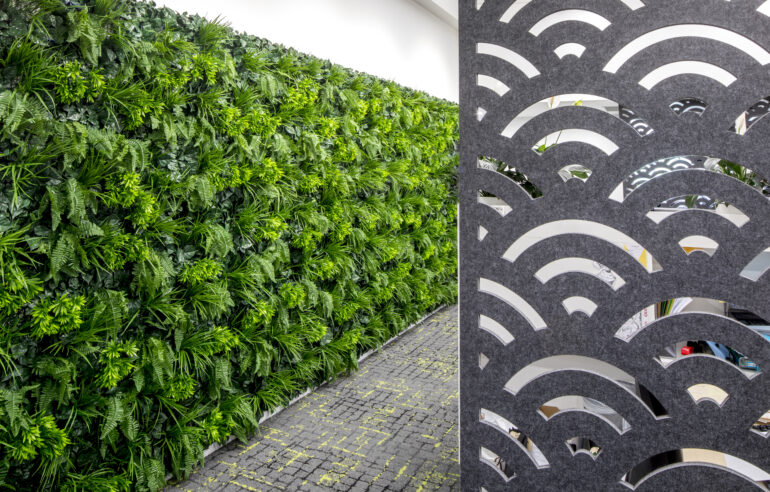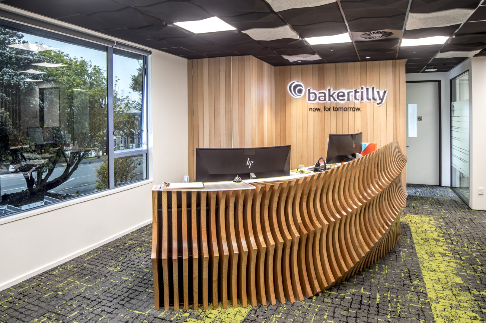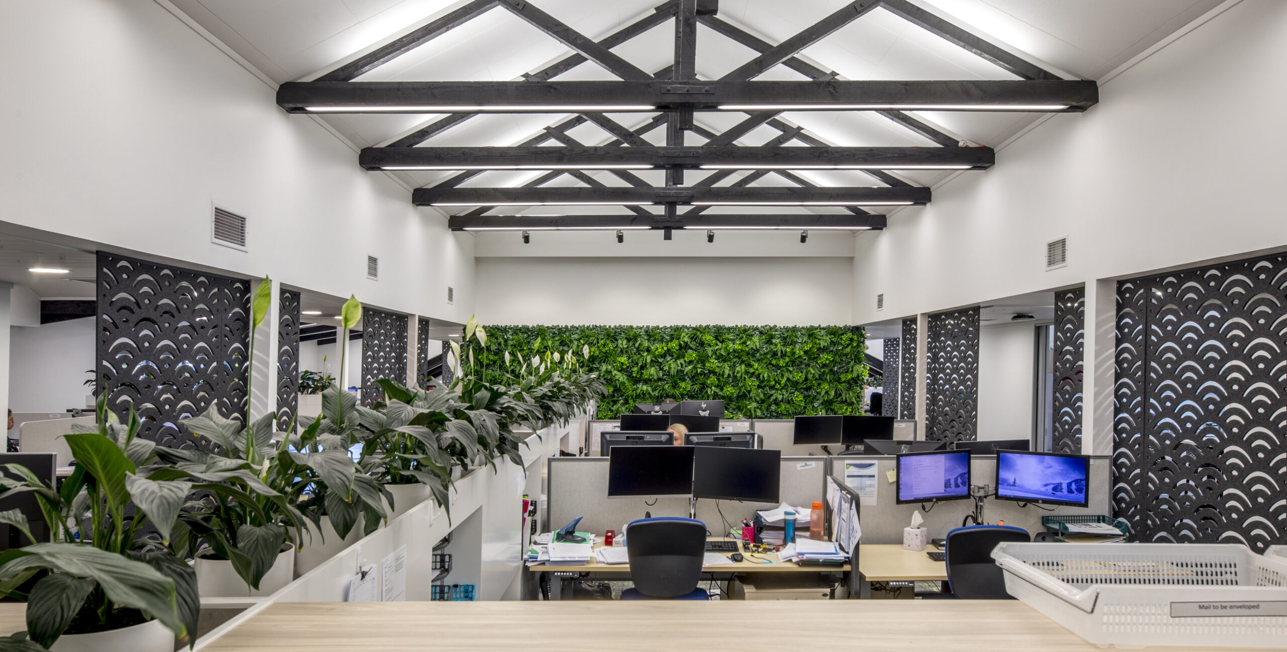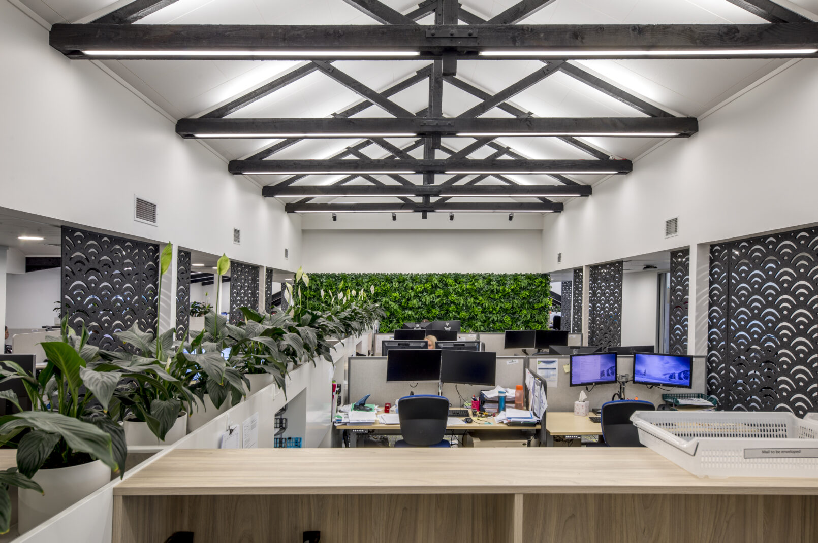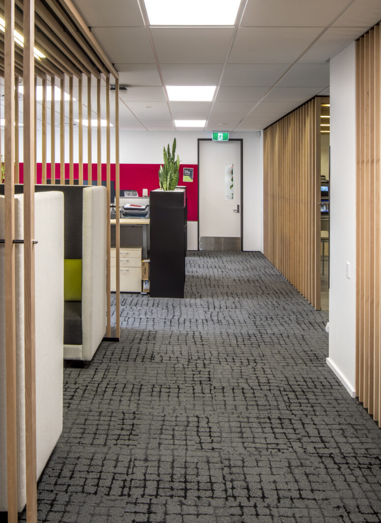 Architectural features include a bespoke moulded timber counter and decorative acoustic partitions, which bring both function and character to the space. The result is a high-quality office environment that balances practicality with design, supporting collaboration and contemporary ways of working.