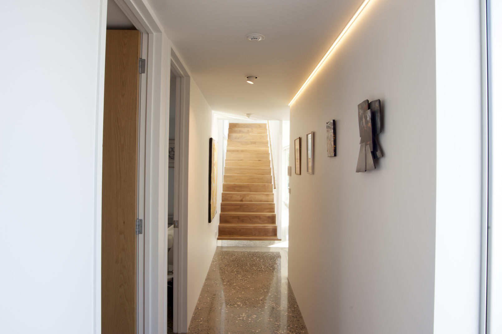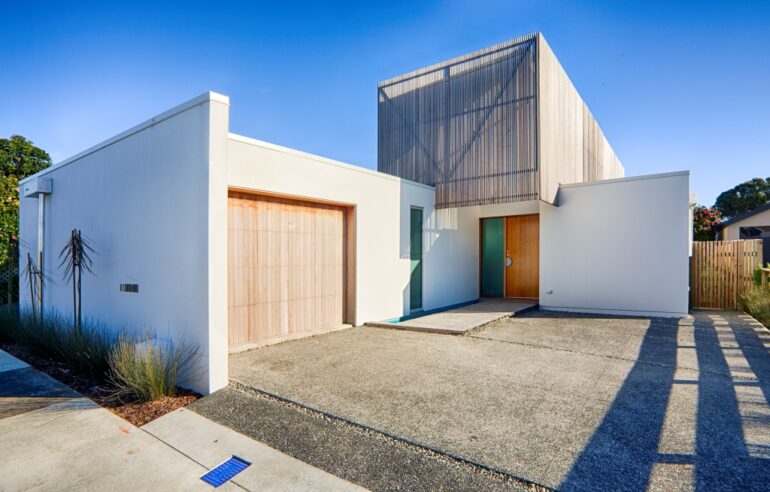 The façade is wrapped in vertical cedar battens, giving the home a distinctive character while providing privacy and solar shading without blocking the outlook. Inside, open-plan interiors are carefully planned to maximise light, with windows positioned to bring natural brightness deep into the home and create a sense of spaciousness within a compact footprint.